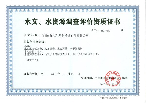 正近日,報水利部批準,我公司獲得水文水資源調查評價乙級資質。該資質是開展相關業(yè)務的基本資格,可以在全國范圍內承擔資質證書核準業(yè)務范圍的各等級水文水資源調查評價工作,主要范圍包括:水文水資源調查、水文分析與計算、水資源調查評價。