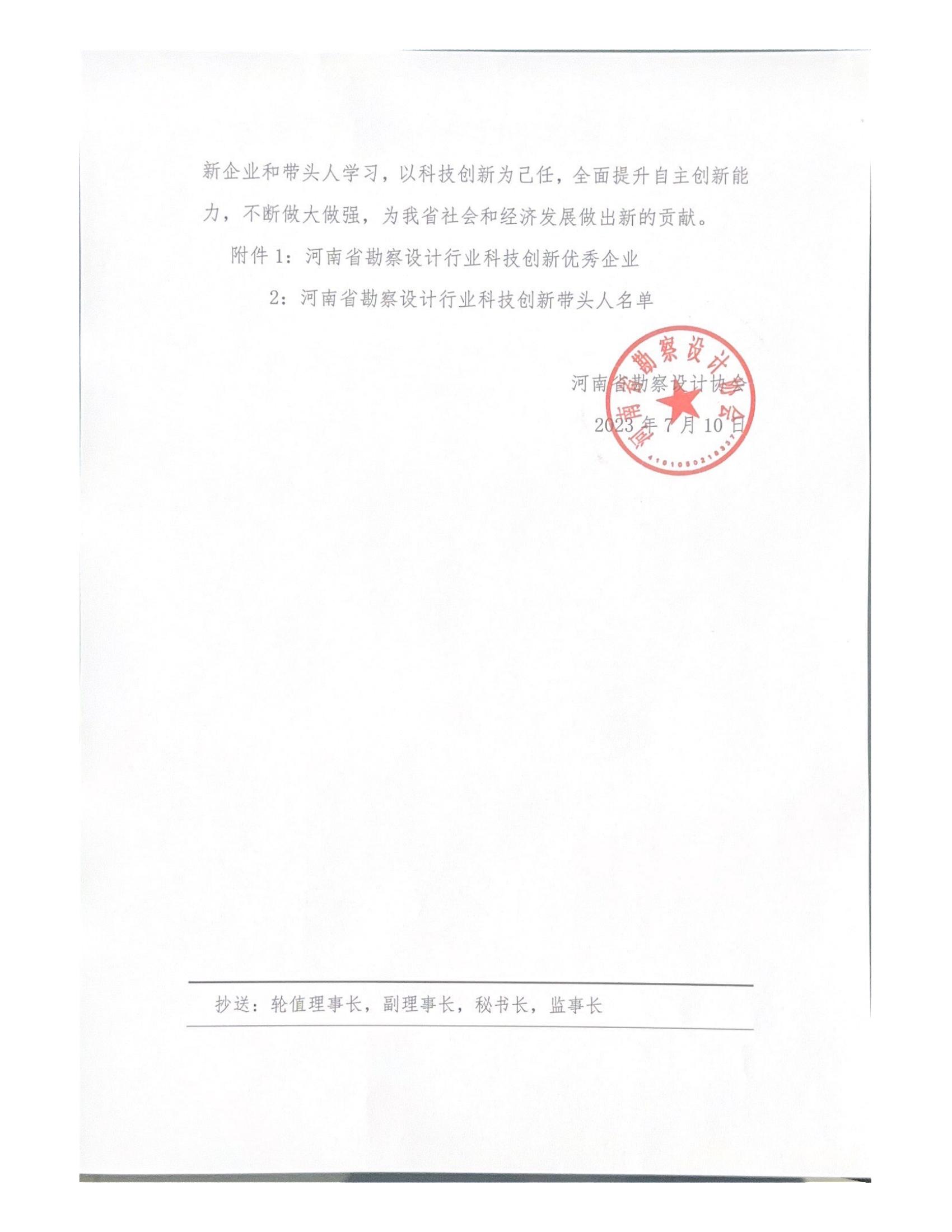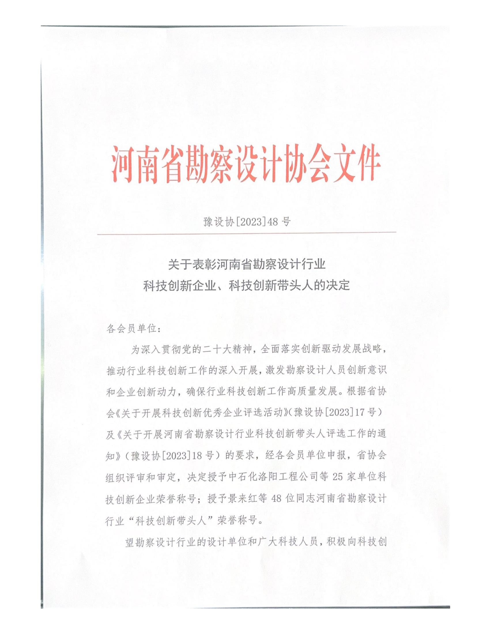 近日,我公司被河南省勘察設計協會評為河南省勘察設計行業科技創新企業榮譽稱號,公司董事長、總經理張文敏被評為科技創新帶頭人。