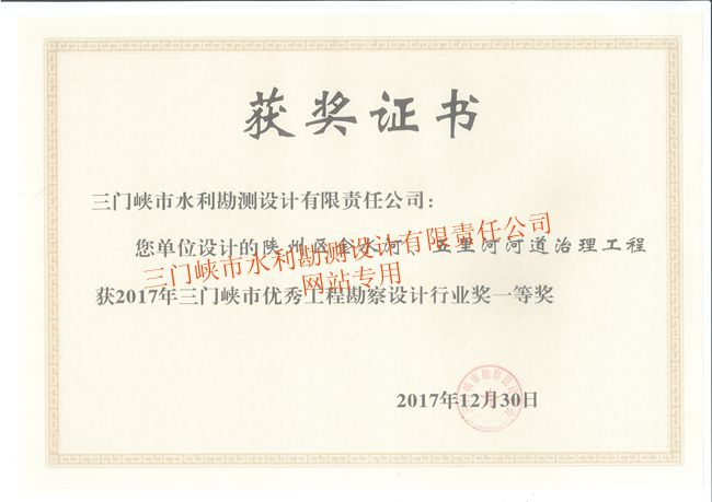 陜州區(qū)金水河、五里河河道治理工程獲市優(yōu)秀工程勘察設(shè)計行業(yè)獎一等獎