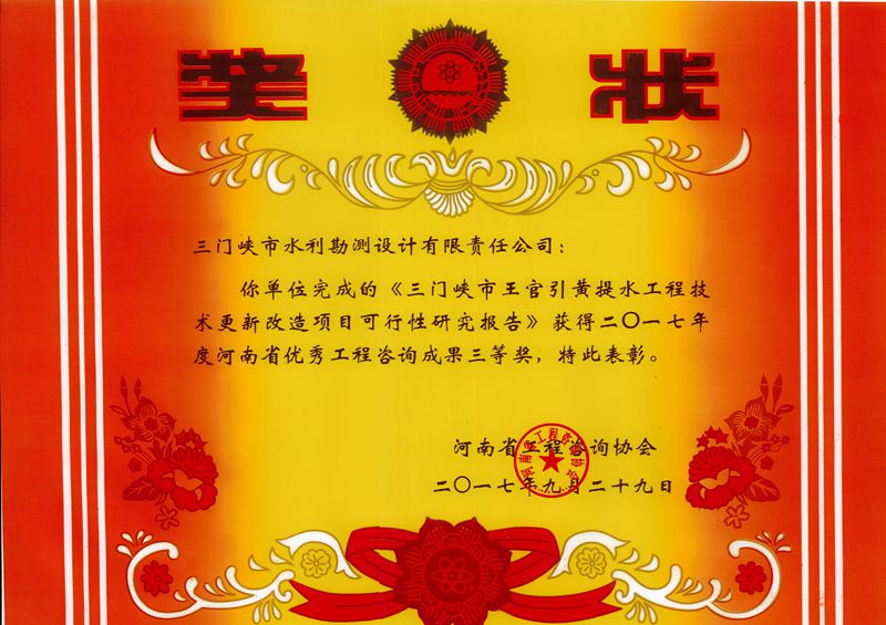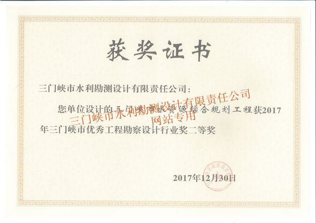 三門(mén)峽市水資源綜合規(guī)劃工程獲市優(yōu)秀工程勘察設(shè)計(jì)行業(yè)獎(jiǎng)二等獎(jiǎng)